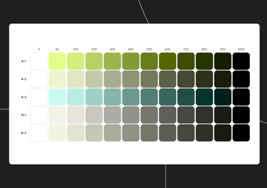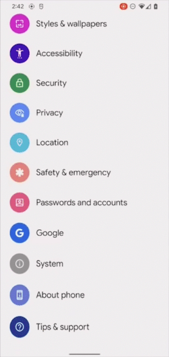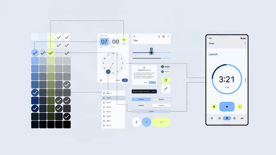 먼저, 색상에 많은 신경을 썼는데 사용하는 시스템 색상 팔레트를 더 풍부하고 폭넓게 제공하여 유저가 배경화면이나 색상을 선택함에 따라 앱에서 사용하는 색상도 자동으로 맞춰져서 동작할 수 있다. 물론 OEM에 따라 다소 차이가 있을 수 있다. API를 통해 색상을 조합하여 사용하고 싶다면 시스템에서 제공하는 색상을 사용하면 된다. 시스템에서 설정된 기본 색, 강조되는 색 등이 자동으로 적용되어 앱을 그릴 수 있다. 색상 팔레트는 Public API를 통해 사용할 수 있으며 방대한 양이 제공된다. 기기 전체에서 사용하는 색상 팔레트를 인덱싱하고 채도를 변경하여 사용할 수 있다.