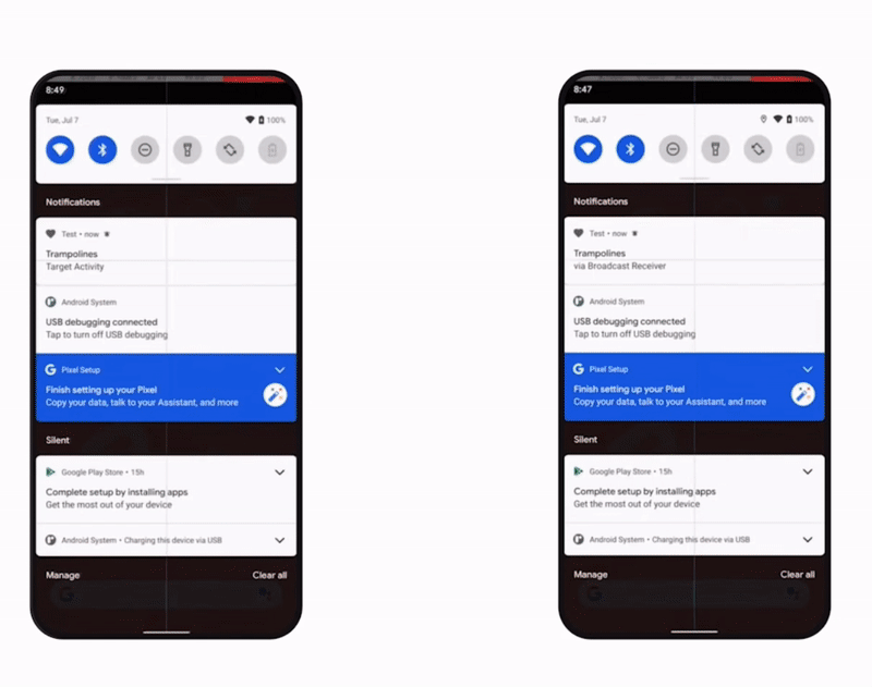 Notification에서 알림을 선택하여 앱을 실행할 때, 오른쪽 이미지와 같이 중간에 공백기가 생기면서 멈춘 것처럼 느껴지는 경우가 자주 있다. 이는 유저 경험을 안 좋게 만드는데,앱이 알림에서 Activity를 직접 시작하지 않고 broadcast를 보내거나 service를 시작하기 때문이다. 많은 앱은 모든 알림에 진입점을 만들고 background에서 앱을 시작하는 형태로 구현되어 있으며, 이를 trampoline이라고 한다. 앞으로 개발자는 반드시 알림의 콘텐츠 인텐트에서 Activity를 시작하도록 구현해야 한다. 그렇지 않으면 알림이 작동하지 않도록 trampoline 자체를 막았다.