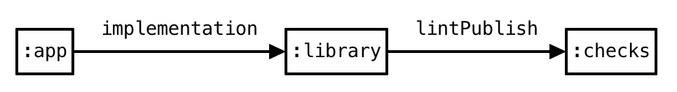 Custom Lint를 구현하고 적용하기 위해서는 2개의 모듈을 추가해야 한다. 앱은 library 모듈에 dependency를 가지면 되고, library 모듈은 checks 모듈에 dependency를 가지면 된다. 실제 린트 검사를 위해 필요한 내용들은 checks에 있고 library는 이 checks 모듈을 lintPublish dependency를 가진다. (이름은 맘대로 가능)