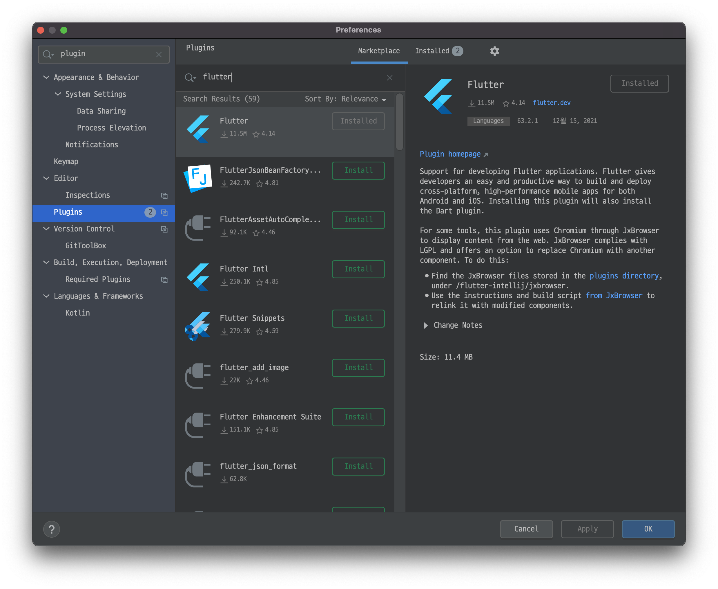 Android Studio의 Preferences - Plugins에 들어가서 Marketplace에 Flutter를 검색하고 설치해주면 된다. 간단하다. 설치를 하려고 하면 Flutter 플러그인은 설치를 위해 Dart 플러그인이 필요하다고 설치할 거냐고 물어볼텐데 Install을 선택해서 같이 설치해주면 된다.