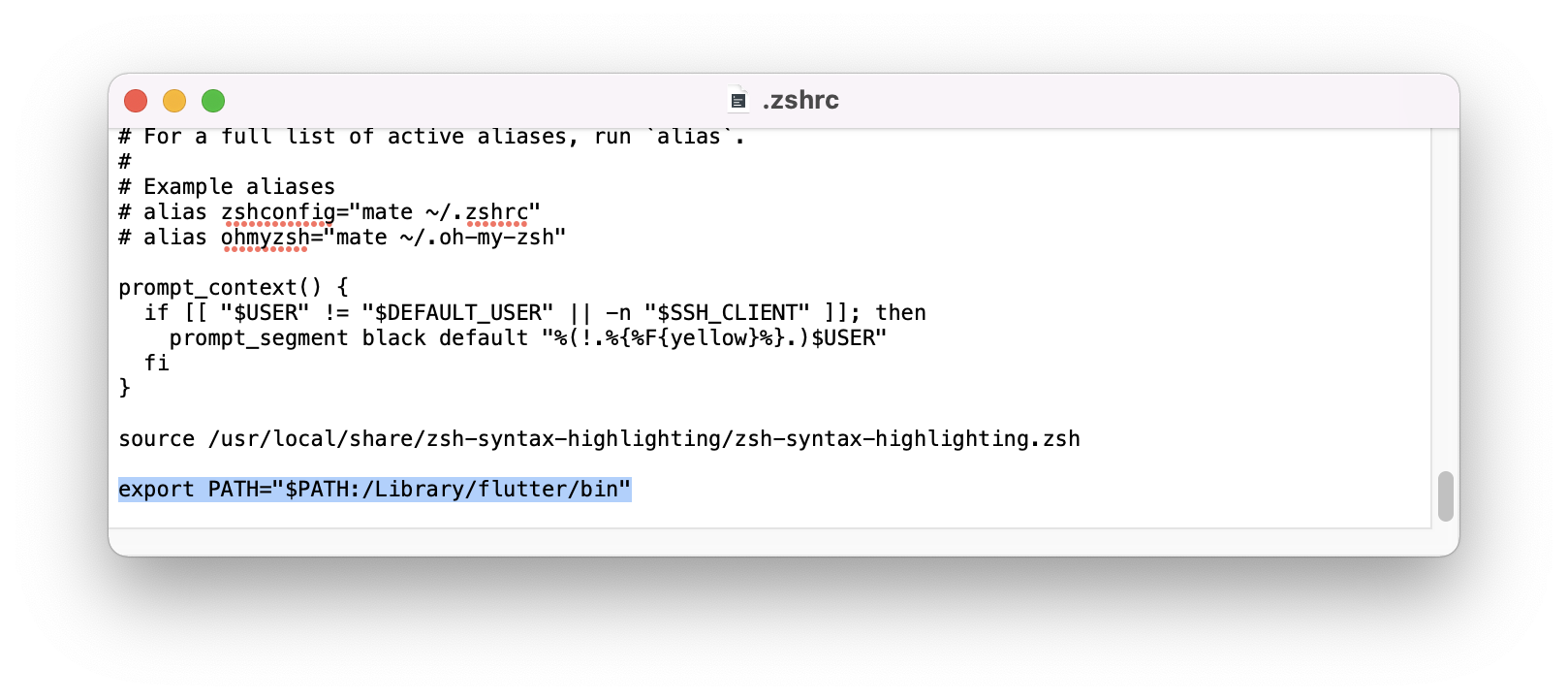 파일의 내용 맨 하단에 위와 같이 지정해준 flutter SDK 하위의 /bin 경로까지 PATH에 추가해주고 저장한 후 닫는다. 그리고 터미널에서 source ~/.zshrc를 입력해서 바로 적용해준다.