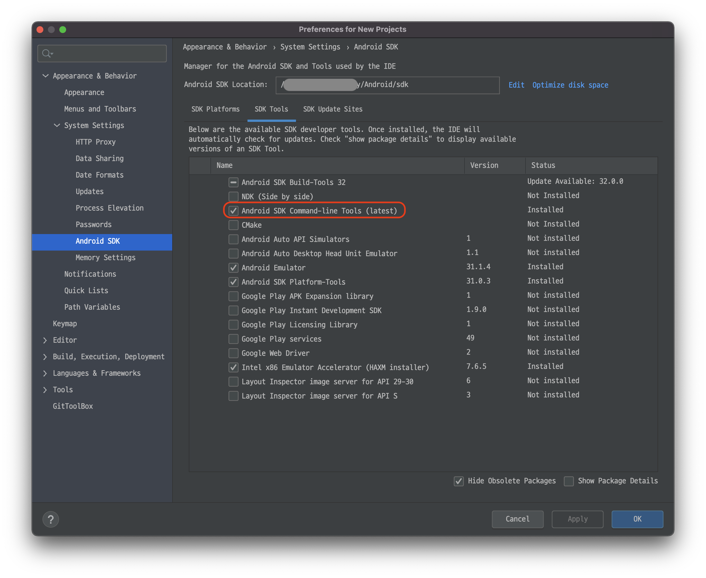 Android toolchain은 안드로이드 스튜디오의 SDK Manager의 SDK Tools 탭에서 쉽게 설치할 수 있다. 빨간색 표시해 둔 Android SDK Command-line Tools를 체크하여 설치해주면 된다.