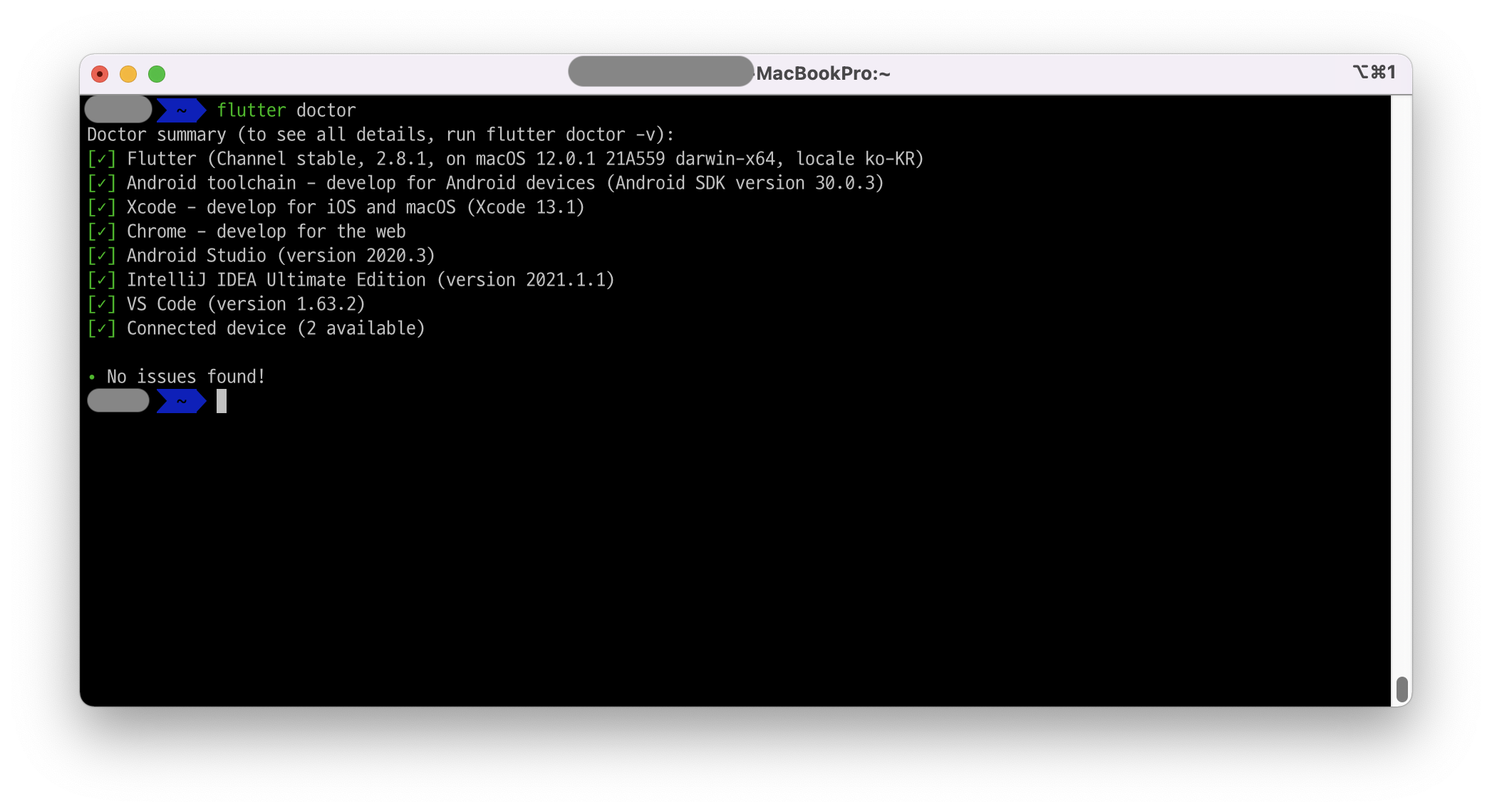 설치하고 나서 터미널에서 flutter doctor --android-licenses 커맨드를 입력하여 동의 내용들에 y를 입력하여 동의해주면 된다. flutter doctor 를 입력하여 Android toolchain이 제대로 설치되었는지를 다시 확인할 수 있다.