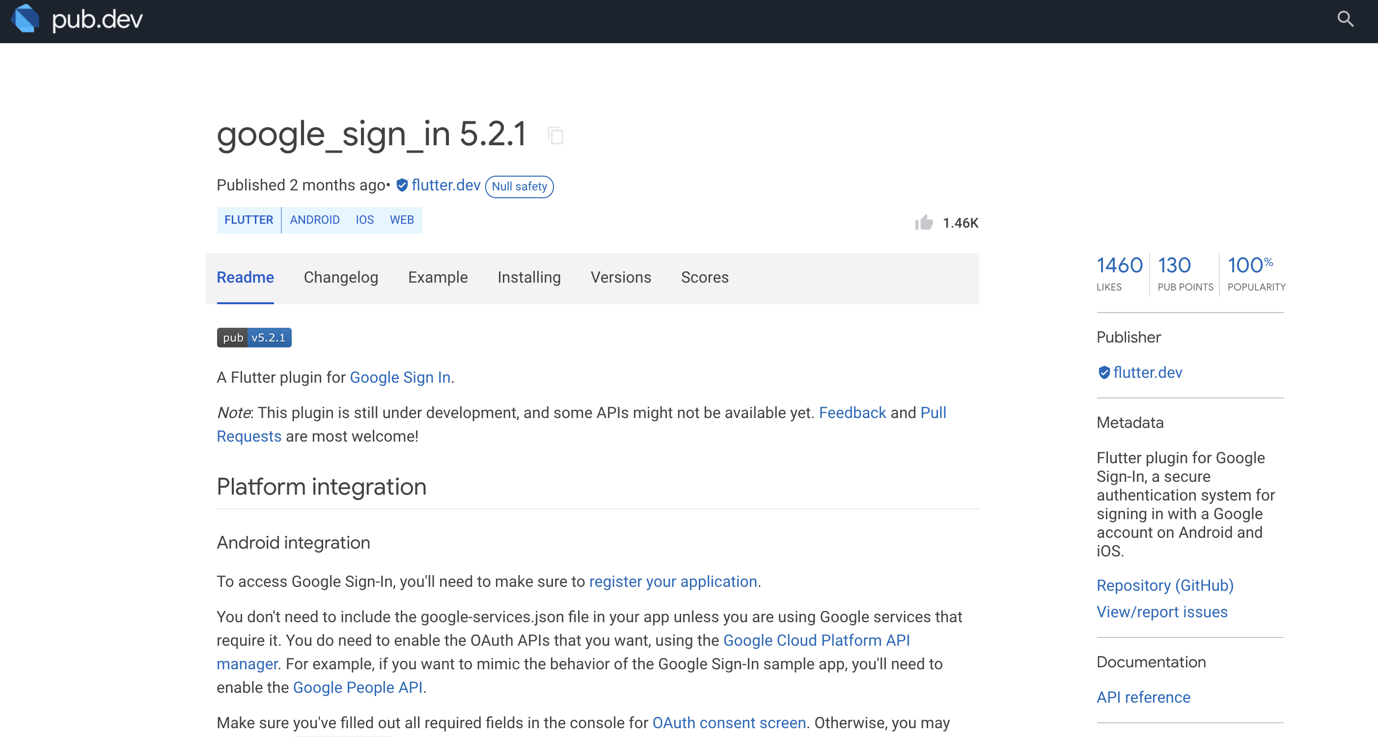 구글 로그인 기능이 필요하다면 위와 같이 해당 Flutter 플러그인을 찾아 사용하면 된다.