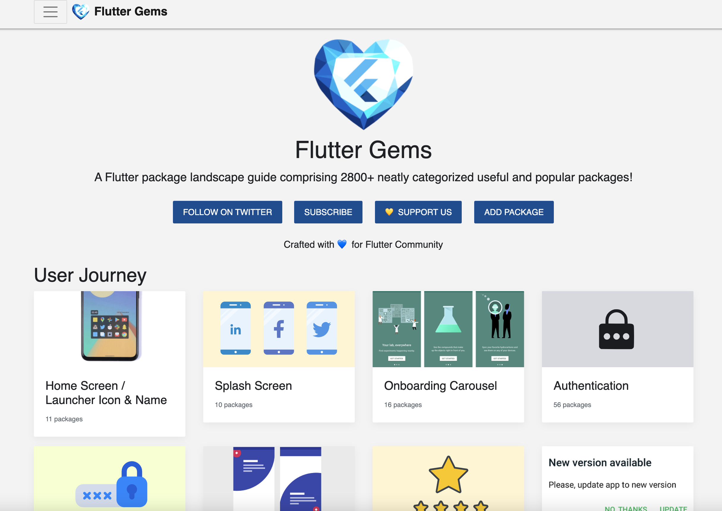 Flutter Gems is a curated package guide for Flutter which functionally categorizes some of the most useful and popular flutter packages available on pub.dev