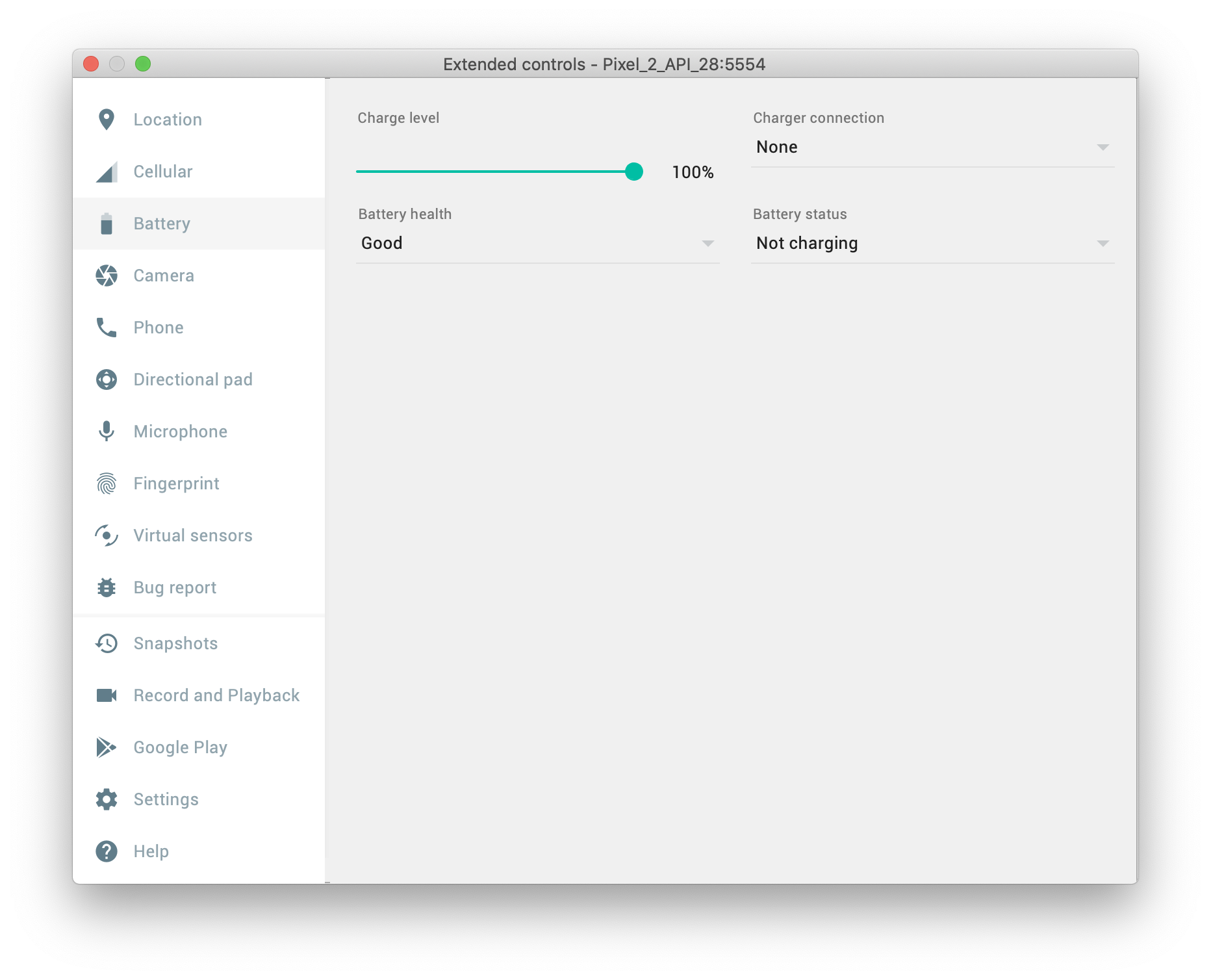 Virtual sensors 탭에서는 기기에 달려 있는 각종 센서의 값을 임의로 설정해줄 수 있다.