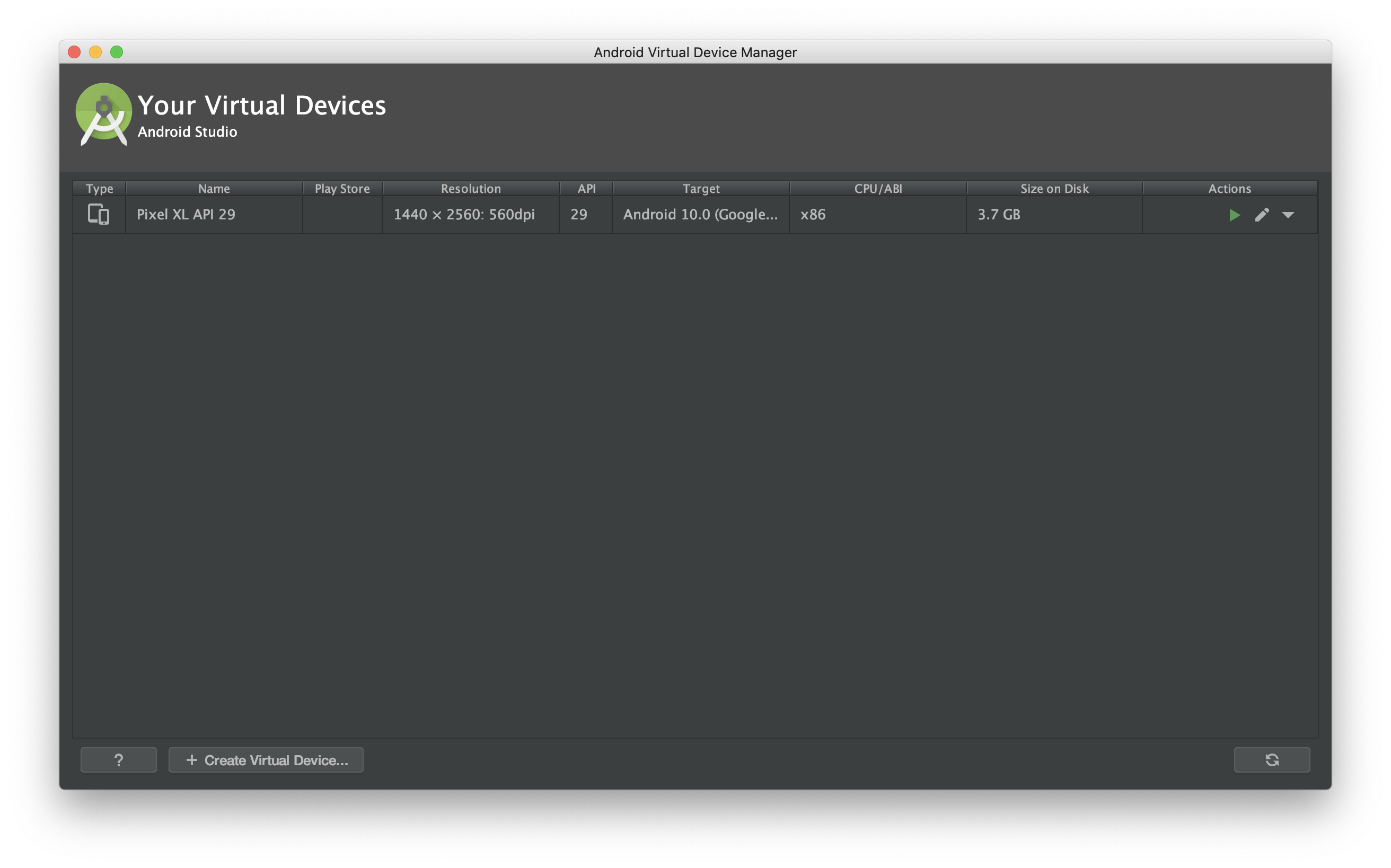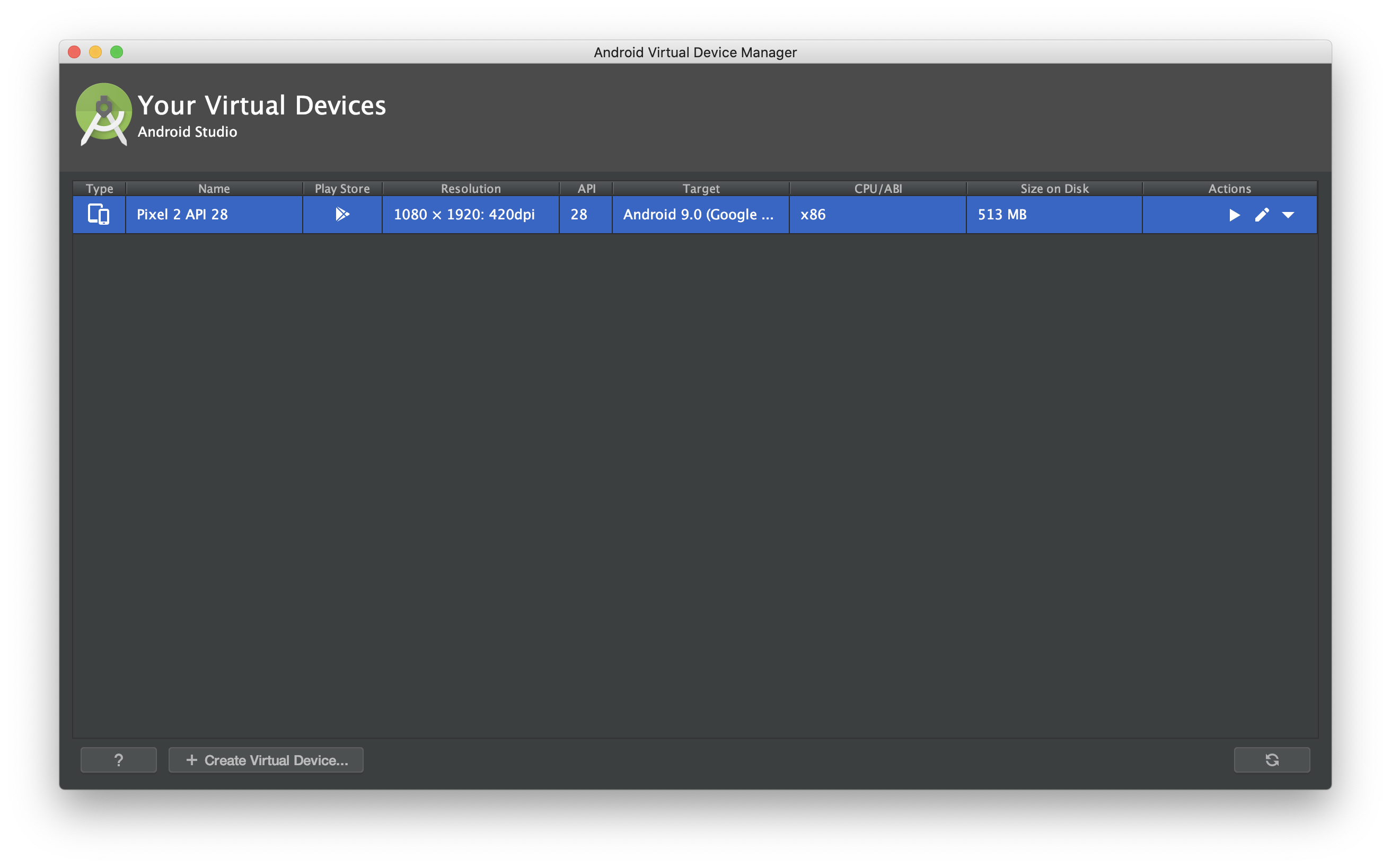 "Finish"를 클릭하고 나면 위와 같이 디바이스가 만들어진 것을 확인할 수 있다. 우측에 있는 Actions에서 디바이스를 실행하거나 설정을 다시 변경할 수 있다.