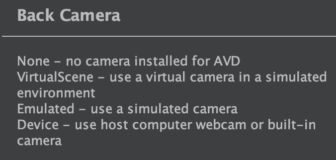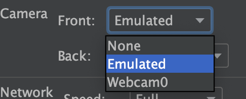 전면 카메라는 없이 할지, Emulated (Simulated)를 쓸지, PC의 웹캠을 사용할 지를 고를 수 있다.