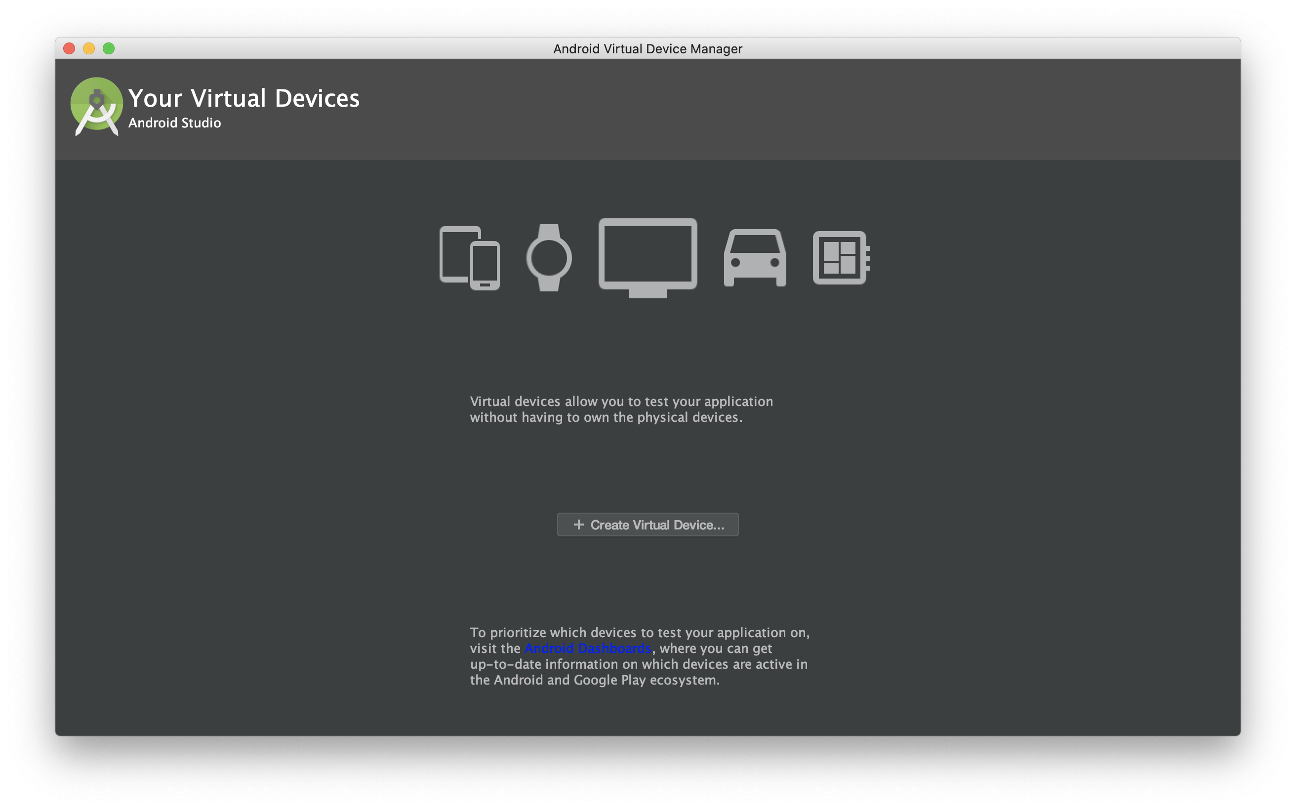 기존에 만들어 둔 에뮬레이터가 없는 경우에는 위와 같이 창이 뜬다.