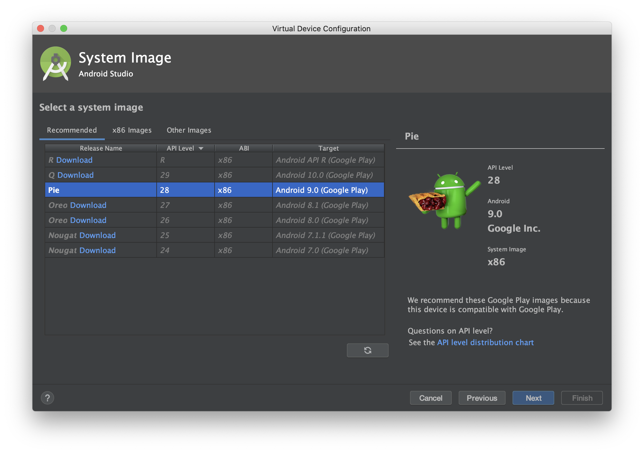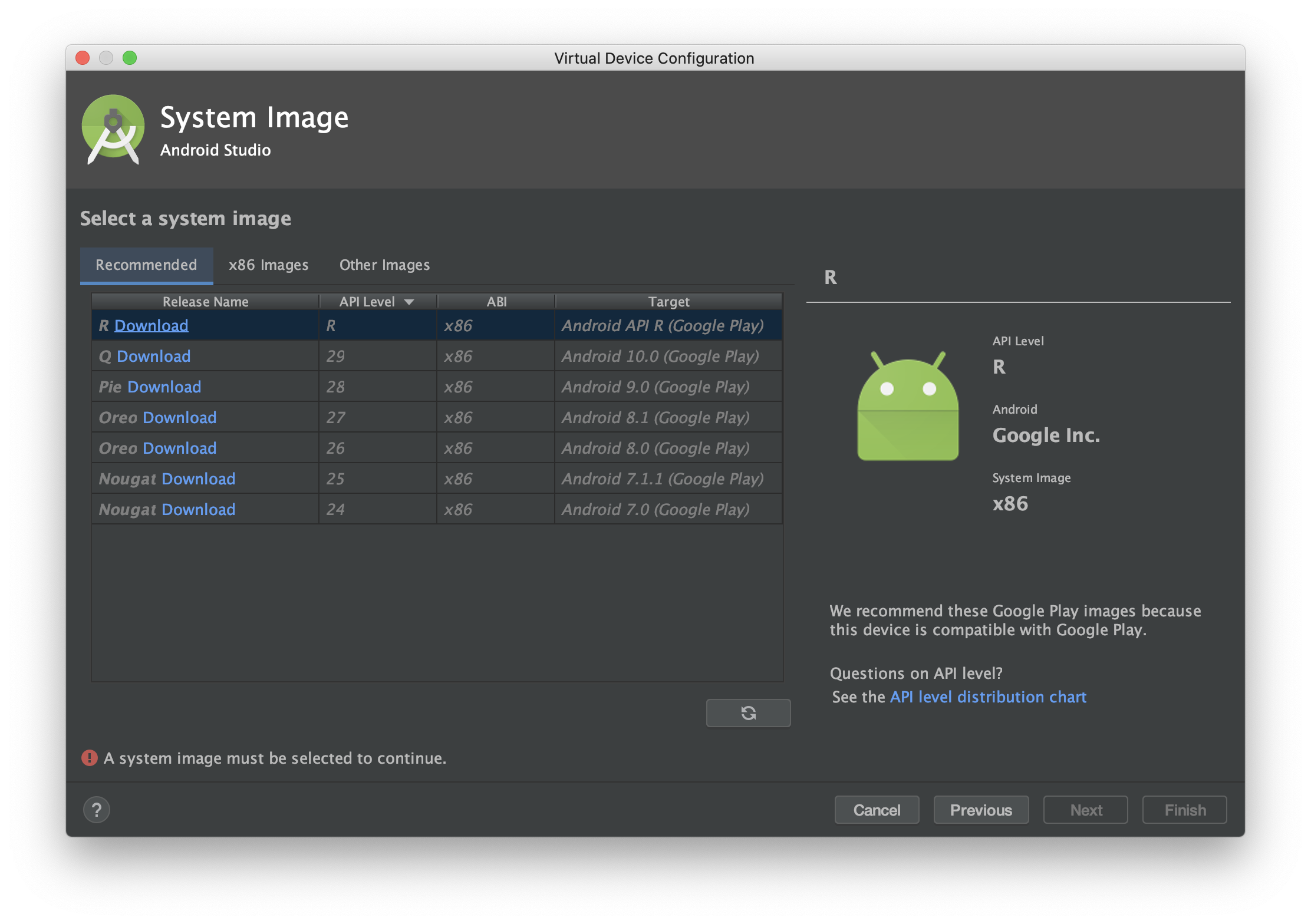 "Pixel 2" 를 선택하고 Next를 클릭하면 위와 같은 모습이 나온다. 하드웨어 선택을 했으니 이번에는 System Image를 선택해야 하는 것이다.아직 다운받은 것이 없어서 필요한 버전을 선택하고 다운로드를 해야 진행할 수 있다. 버전에 따른 타겟과 이에 따라 이용할 수 있는 Google API level이 달라지기 때문에 본인이 진행할 프로젝트의 앱이 실행 가능한 버전을 적절하게 선택한다.