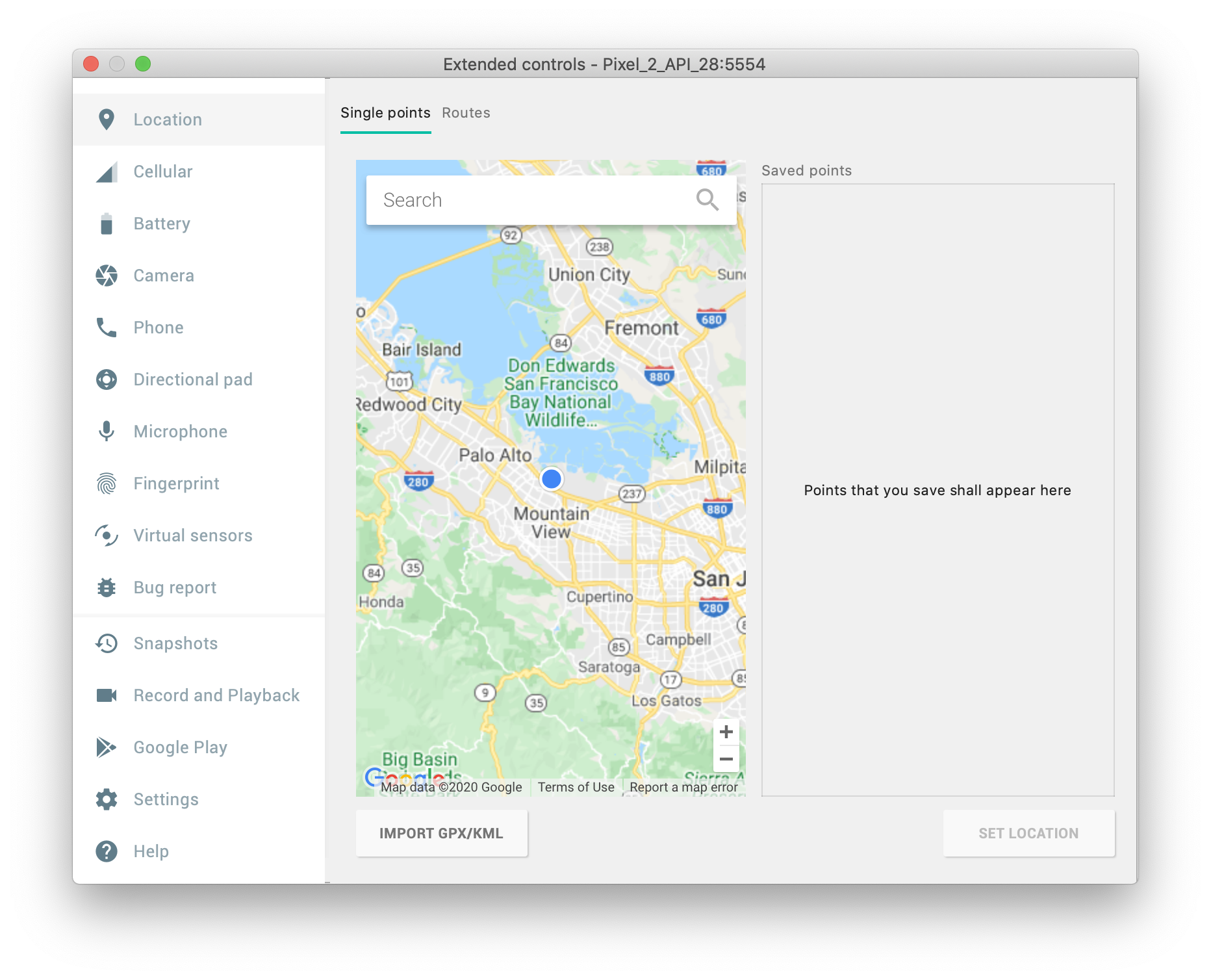 도구 바의 맨 밑에 있는 항목을 선택하면 위와 같이 다양한 컨트롤을 사용할 수 있다. 위와 같은 화면의 Location에서는 테스트를 위해 기기의 위치를 임의로 설정해줄 수 있다.