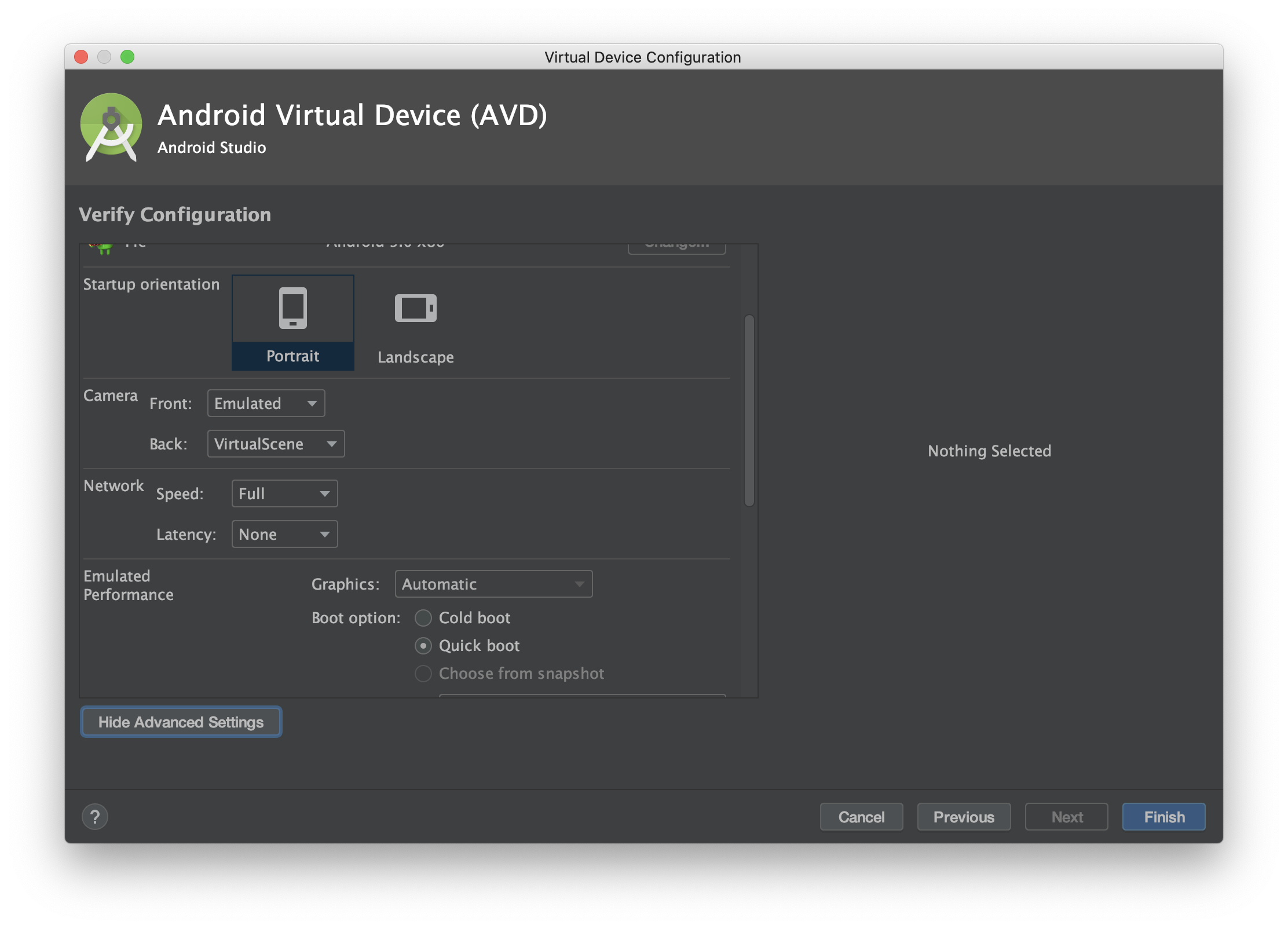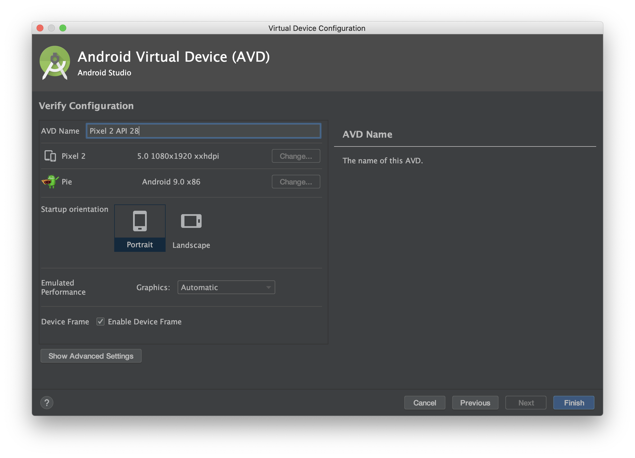 그러면 기본 설정을 할 수 있는 창으로 넘어간다. AVD의 이름과 시작할 때 세로 모드로 시작할지, 가로 모드로 시작할지 등을 선택할 수 있다.