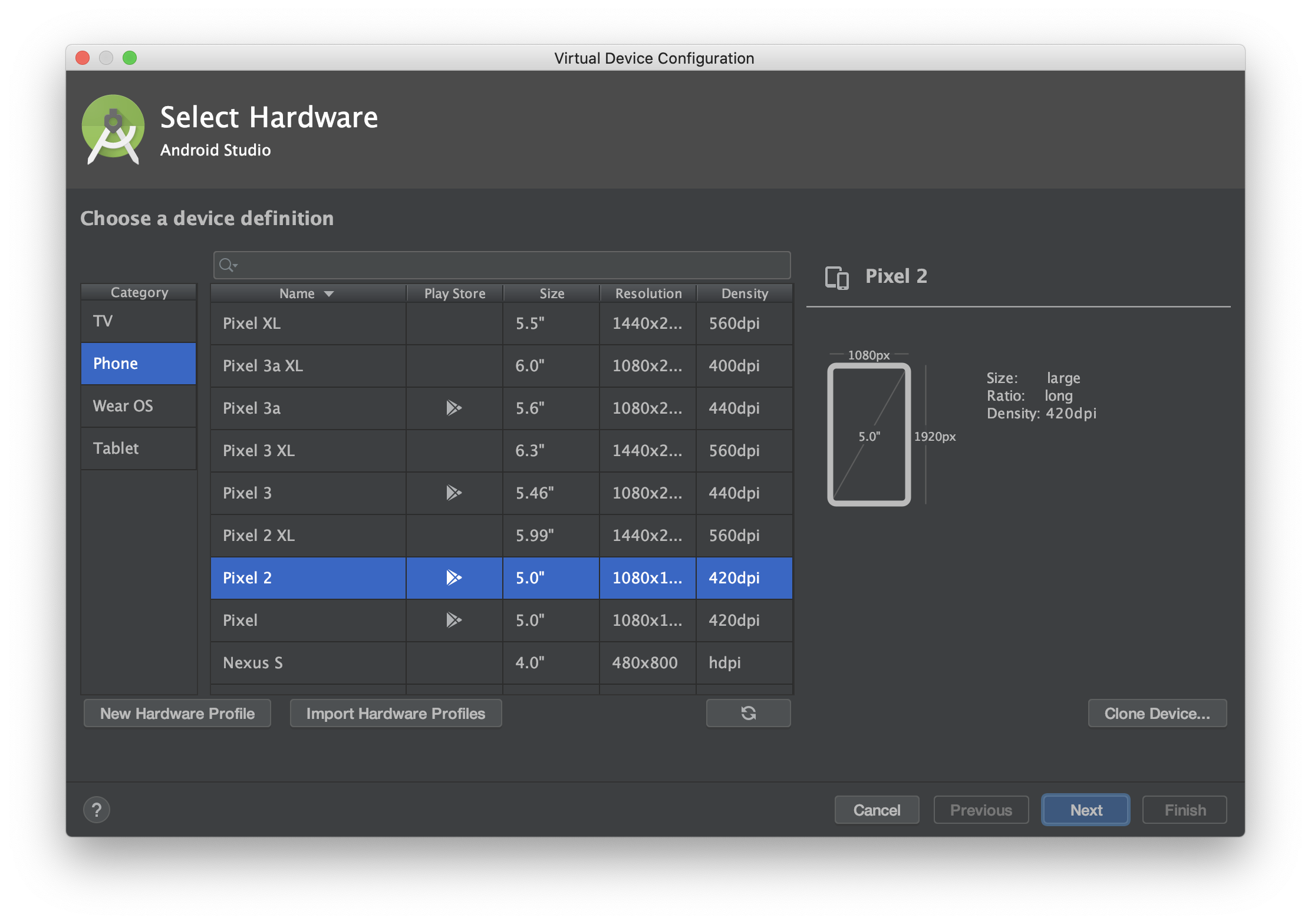 선택할 수 있는 하드웨어의 종류들이 나온다. 카테고리를 보면 TV, Phone, Wear OS, Tablet의 네 가지 종류를 지원하고 있다. 필요로 하는 카테고리를 선택하면 된다. 이번에는 Phone을 생성해볼 것이다.