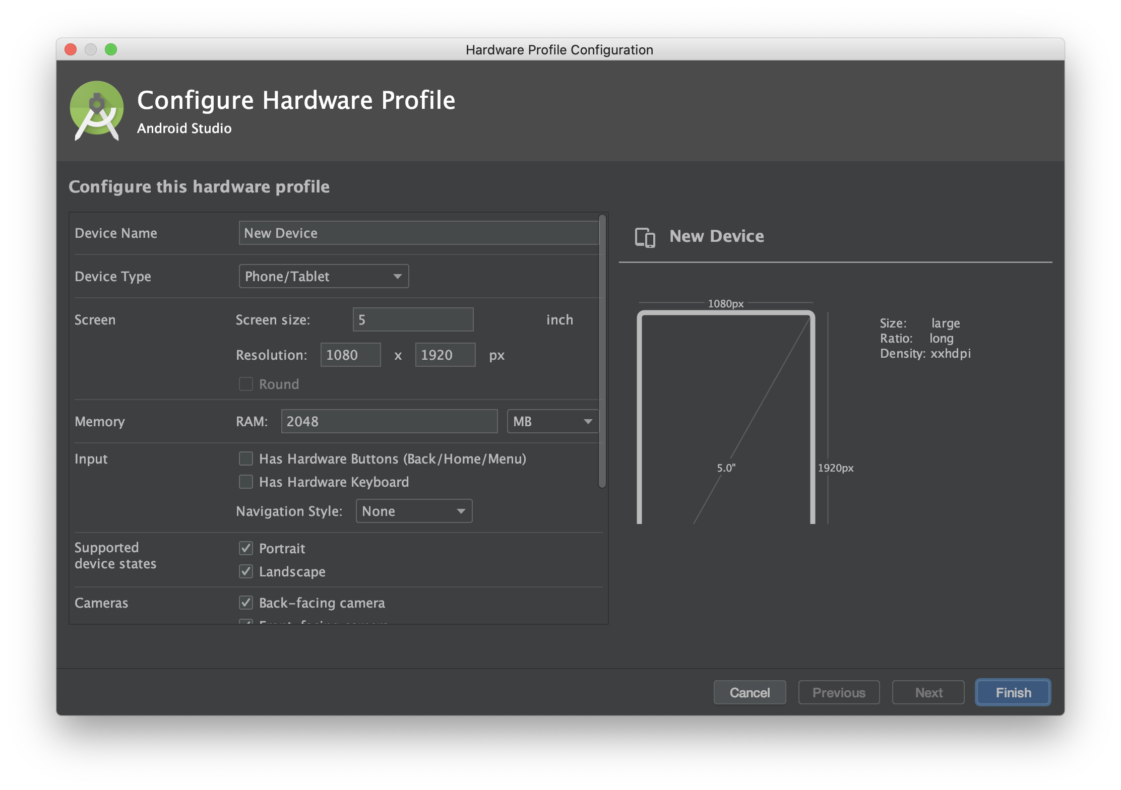 참고로 위에 있는 이미 설정된 기기들이 맘에 들지 않거나, 특정한 하드웨어 조건의 기기가 필요하다면 하단에 있는 "New Hardware Profile"에서 직접 기기 하드웨어 설정들을 해주고 디바이스를 생성할 수도 있다.