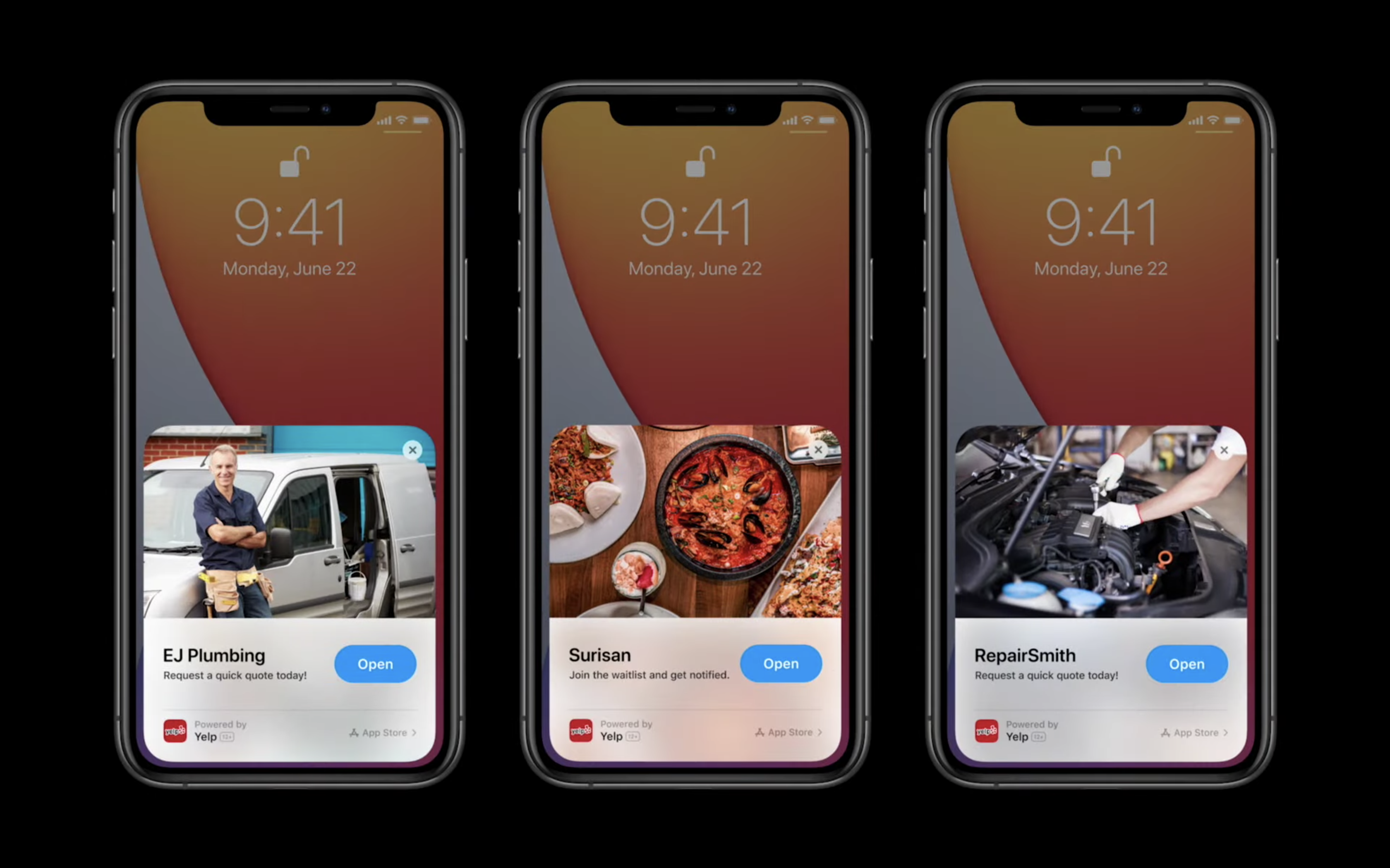 이번 발표 중에서 흥미로운 내용이라고 생각한다. 크기가 10MB보다 작은 초경량 앱으로 직접 앱스토어에서 앱을 받지 않아도 필요한 순간에 사용할 수 있다. 사파리 브라우저 웹, 메시지, 지도, NFC 태깅, QR 코드 스캔 등을 통해 여러 곳에서 사용할 수 있다. 현재 있는 위치에 App Clip이 있다면 직접 찾아서 가져다 대지 않아도 아이폰이 먼저 App Clip이 있다고 알려주기까지 한다. 다음 영상처럼 사용할 수 있다.