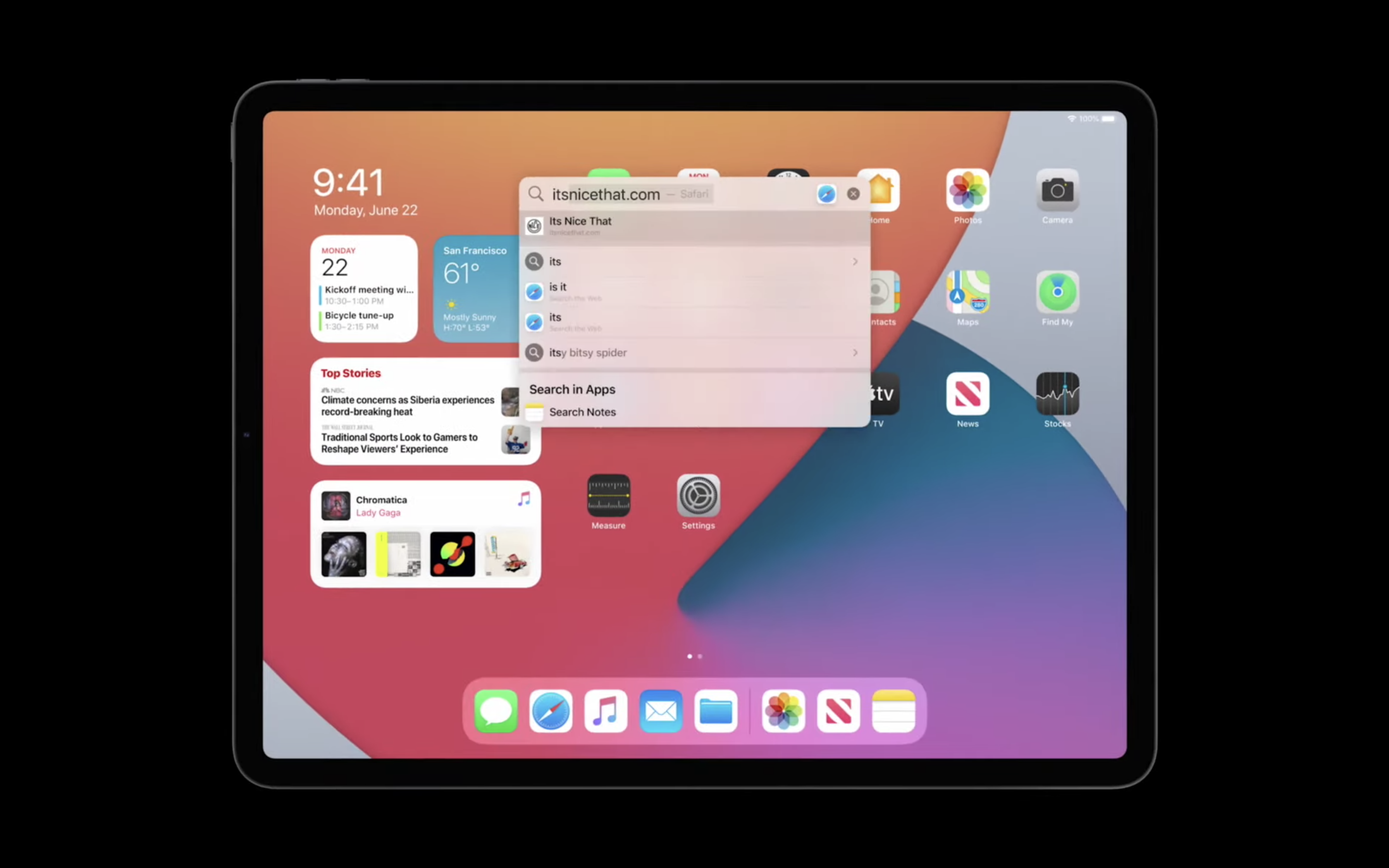 검색 기능도 새로 디자인하고 재구축했다고 한다. 기존의 iOS와는 달라졌지만 Mac 사용 유저라면 어딘가 익숙할 수도 있다. macOS의 Spotlight와 동일하게 생겼으며 기능도 똑같다. 앱을 실행 중일 때를 포함하여 어디에서나 검색 창을 띄워서 앱을 실행하고 문서를 열고 웹 검색을 바로 할 수 있게 되었다.