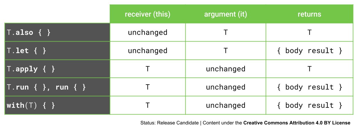 `run`, `with`, `T.run`, `T.let`, `T.also`, `T.apply`