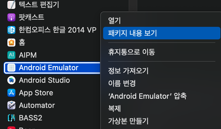 Applications에서 Android Emulator를 우클릭하고 패키지 내용 보기를 선택한다.