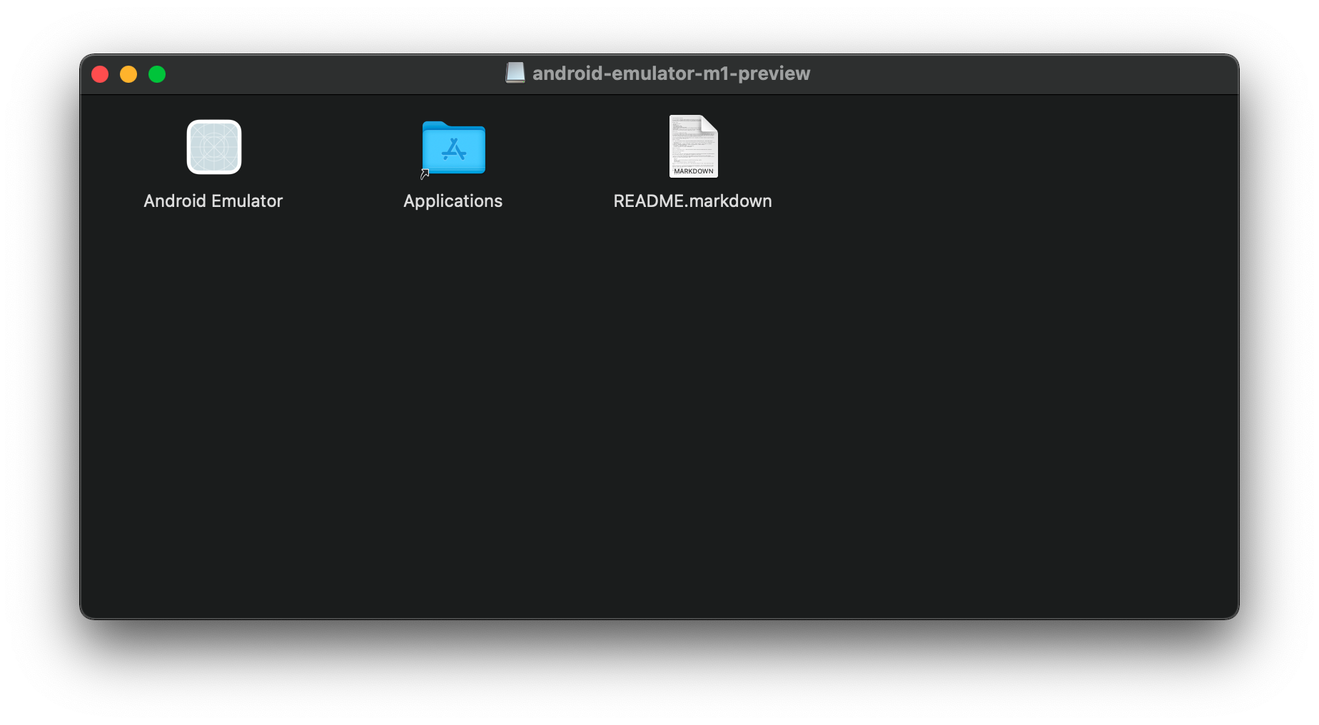 다운받은 android-emulator-m1-preview.dmg 를 마운트하면 위 화면처럼 나오는데 Android Emulator를 Applications로 복사해준다. 다음 작업들을 진행하기 전에 절대로 실행하면 안 된다.