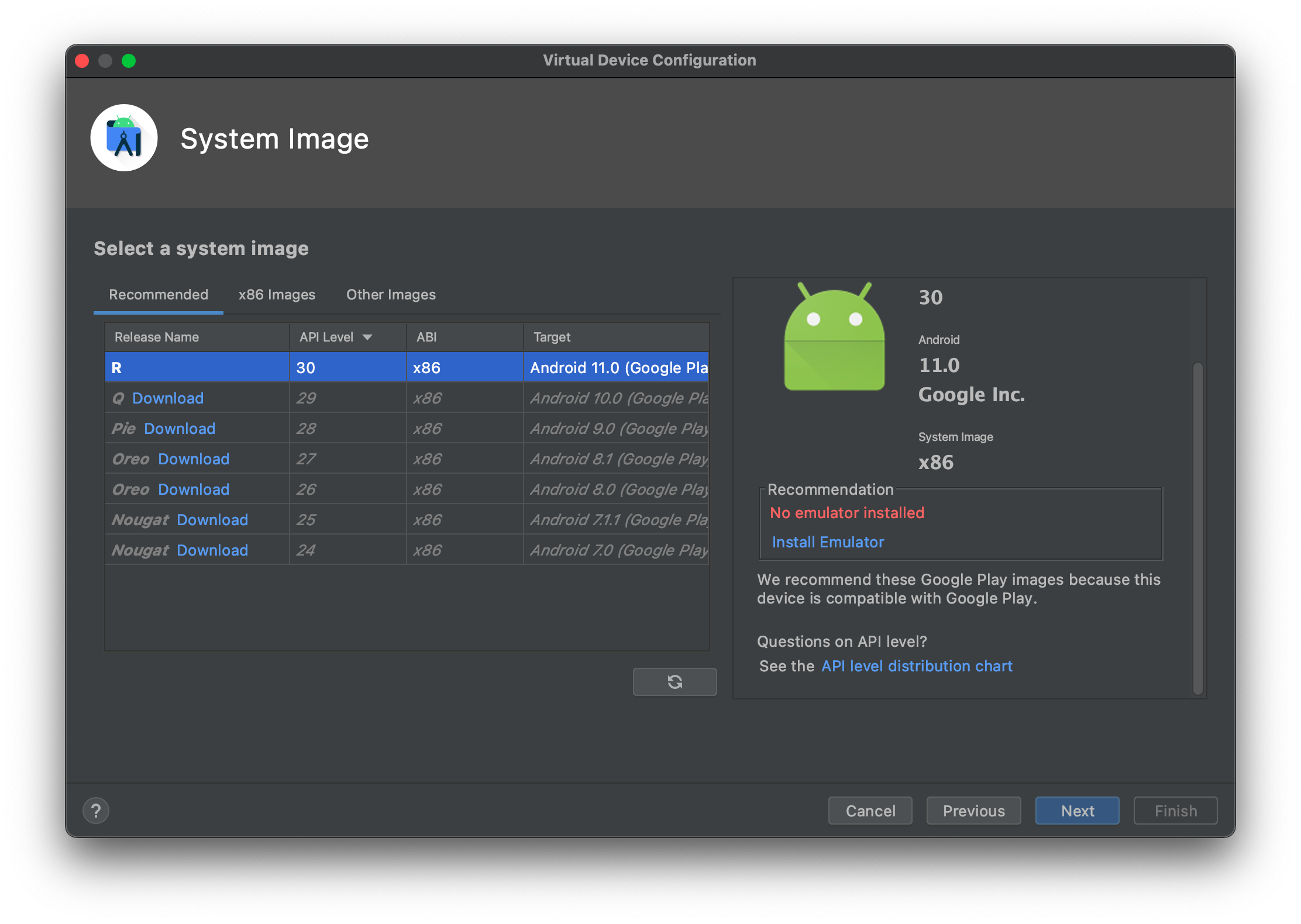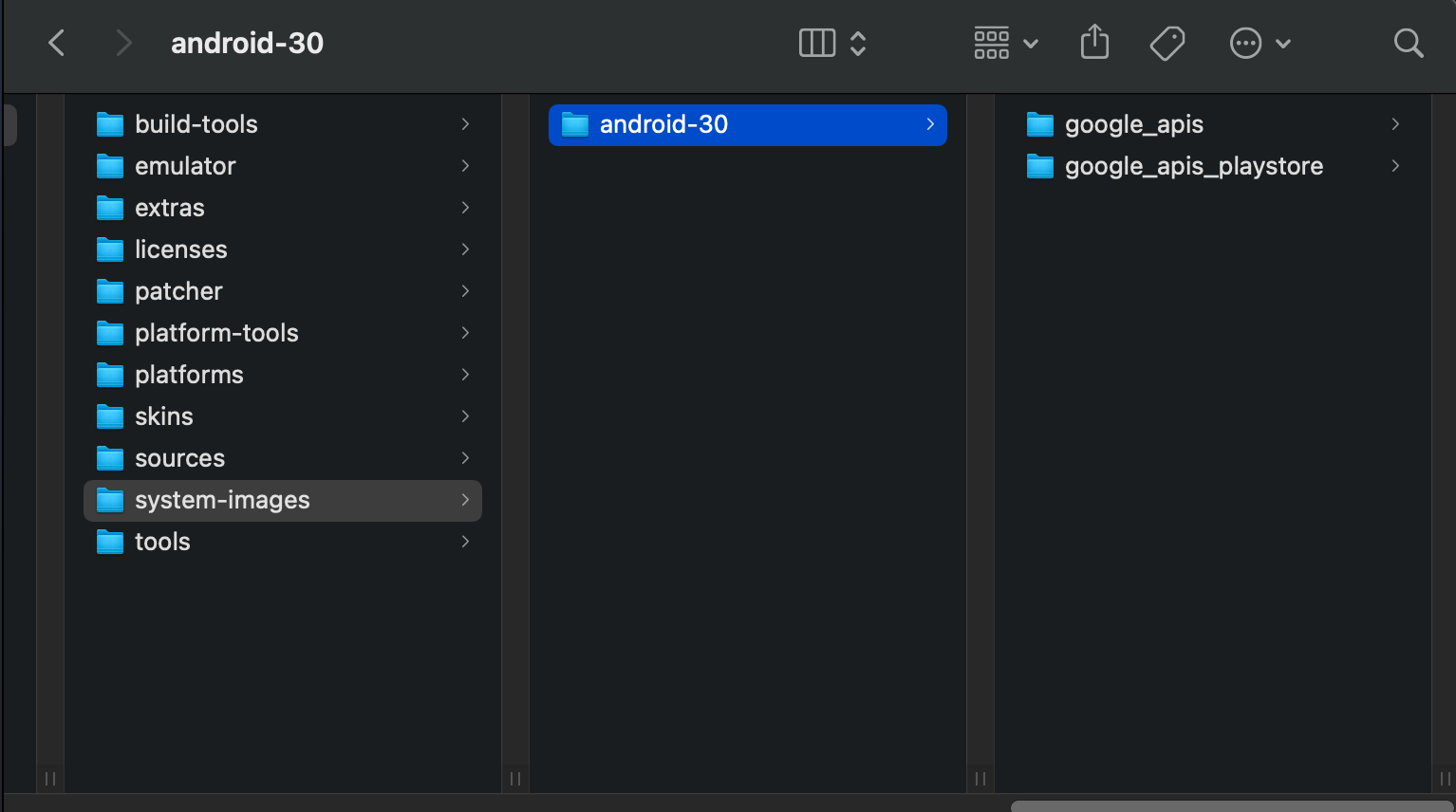 ~/Library/Android/sdk/system-images/android-30/ 경로에 들어가서 google_apis_playstore가 있는지 확인한다.