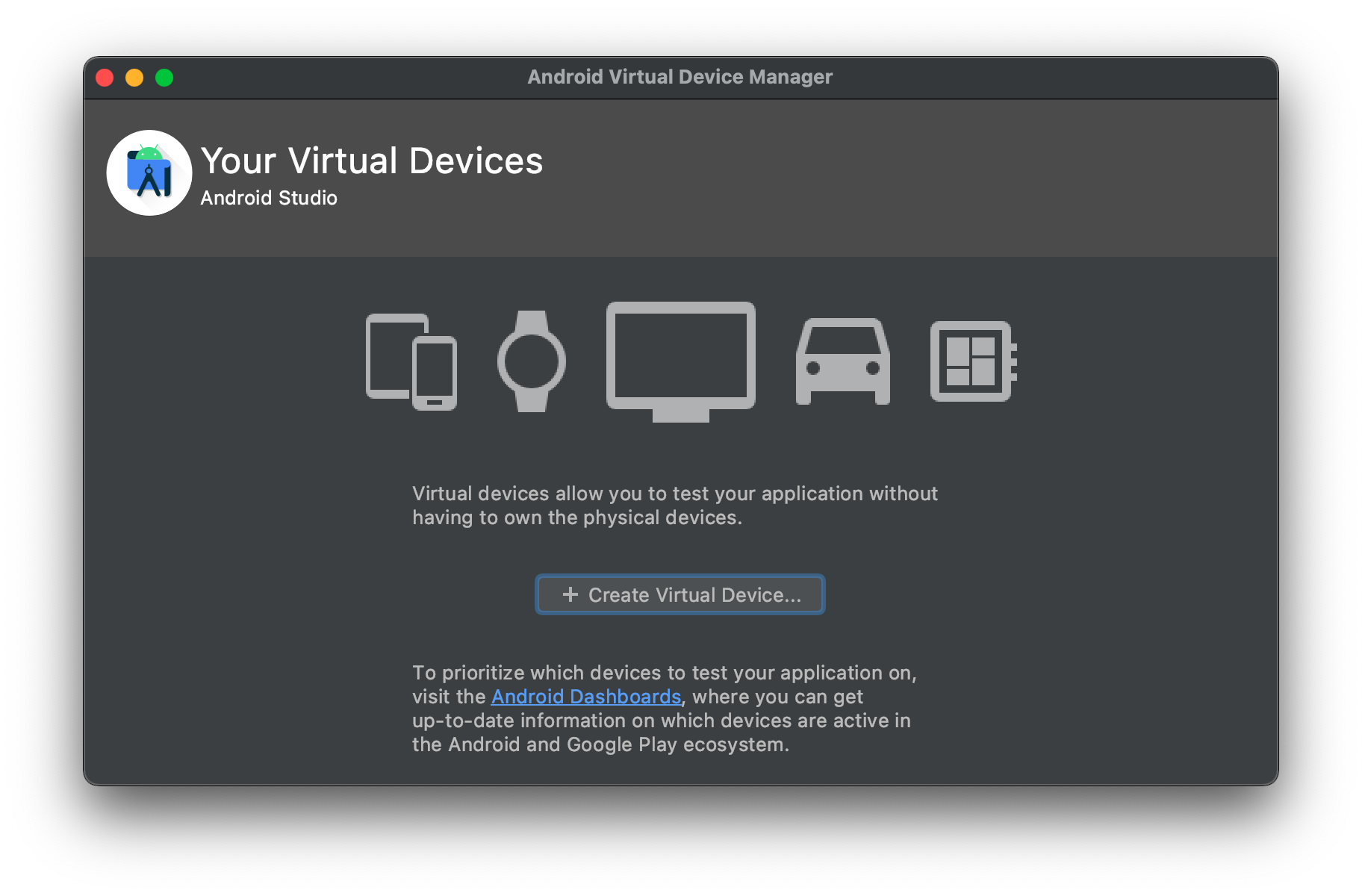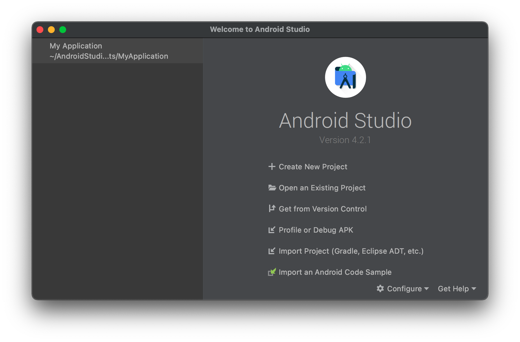 안드로이드 스튜디오에서 사용하는 AVD Manager에서 구글 플레이가 있는 버전의 에뮬레이터를 받고, 여기에서 시스템을 꺼내와서 m1 에뮬레이터에서 사용할 것이다. 안드로이드 스튜디오가 없다면 여기에서 설명대로 다운받고 설치하면 된다. 그 다음에 위의 화면에서 밑쪽에 있는 Configure를 선택한다.