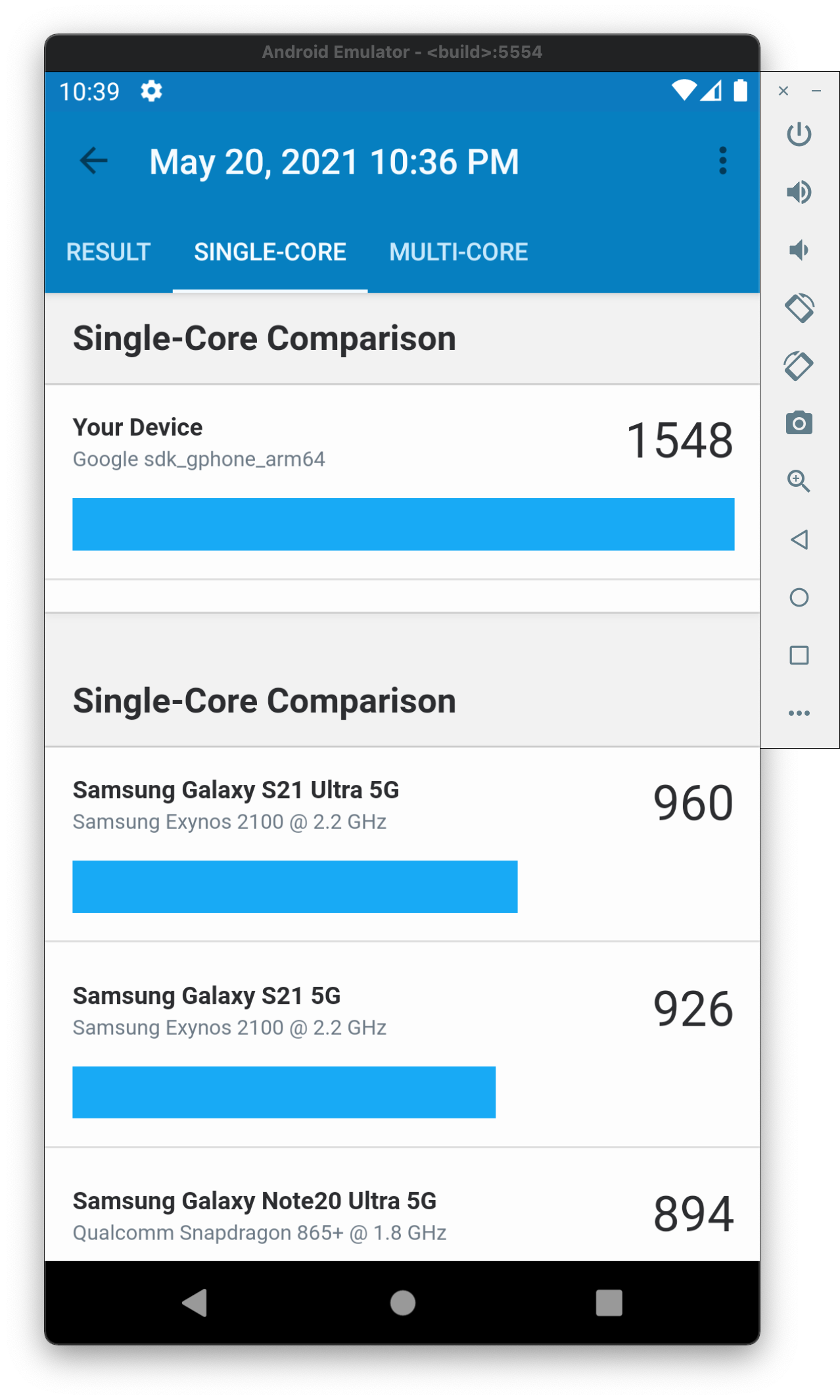 긱벤치5를 받아서 벤치마크도 돌려봤는데 에뮬레이터인데도 성능이 엄청 잘 나온다!