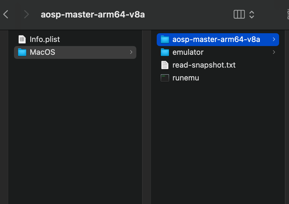 패키지를 열어서 /Applications/Android\ Emulator.app/Contents/MacOS/aosp-master-arm64-v8a 이 쪽에 내용들이 잘 있는지 확인한다.