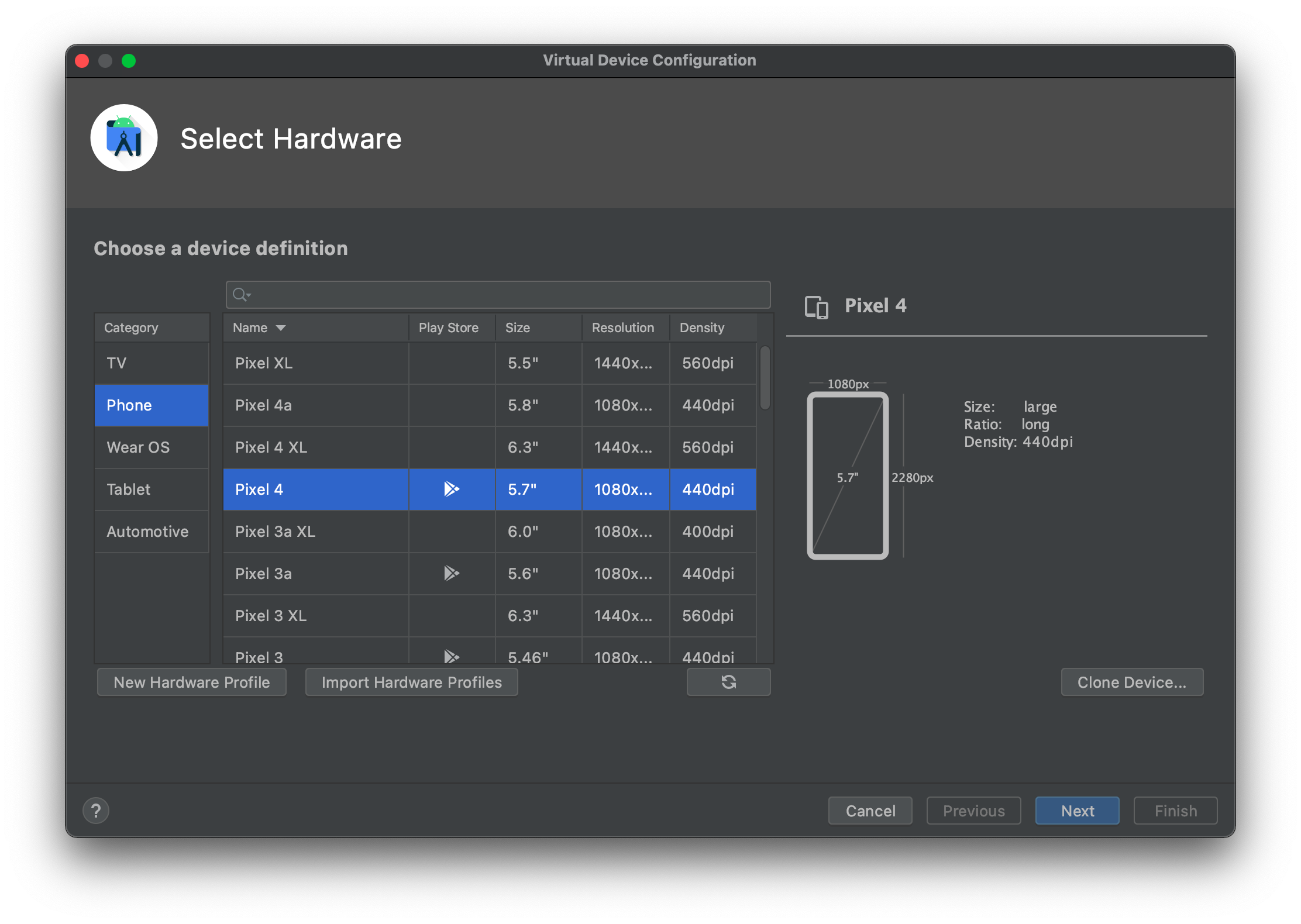 Play Store(플레이 스토어) 표시가가 있는 걸 선택하면 되는데, Pixel 4를 선택했다.