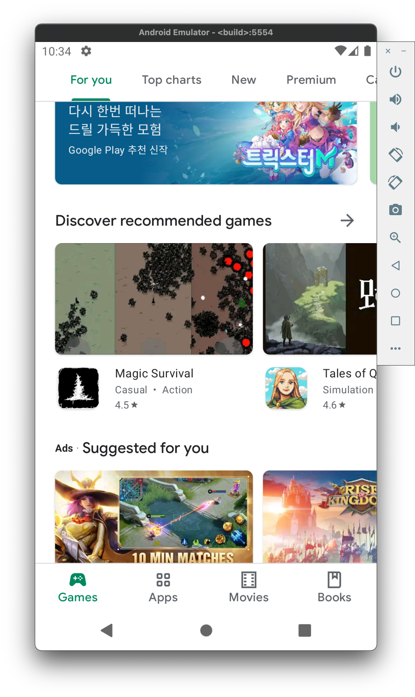 이제 Android Emulator를 실행시켜보면 구글 플레이가 설치되어 있고 잘 되는 걸 확인할 수 있다. 이 방법으로 M1 칩을 사용하는 맥북, 맥미니, 아이맥에서 구글 플레이가 있는 안드로이드 에뮬레이터를 사용할 수 있다.