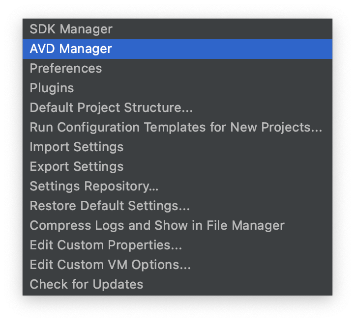 이런 메뉴가 나오면 AVD Manager를 선택한다.